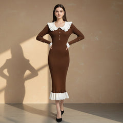 Elevate your wardrobe with this viscose fiber knitted midi dress, designed for women who appreciate a mature, elegant, and polished look. Crafted from 95%+ viscose, the fabric offers a soft, silky drape that flatters the figure effortlessly. The pencil skirt silhouette elongates the body, while the lotus leaf collar adds a refined, feminine charm. Featuring long sleeves, a high-waisted fit, and delicate button detailing, this dress blends sophistication with modern street-style influence. Perfect for social outings, elegant events, or chic daily wear.